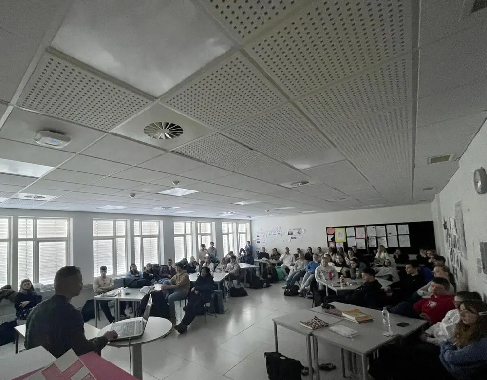 Rolf-Erik Poppe i samtale med Anne Marit Noraker saman med seksti elevar på VG1 Magni Moe Westgaard