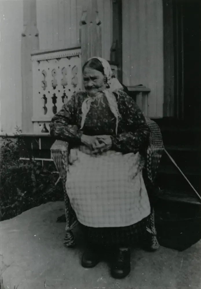 Biletet vart teke på 90-årsdagen. I fiskebua på Bautahaugen er det rester av eit fiskegarn som Berte har laga. Det er laga av hestetagl og har søkker med bjørkenever og grus.