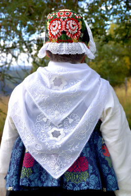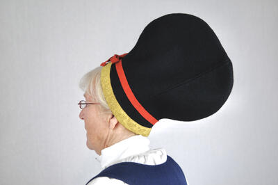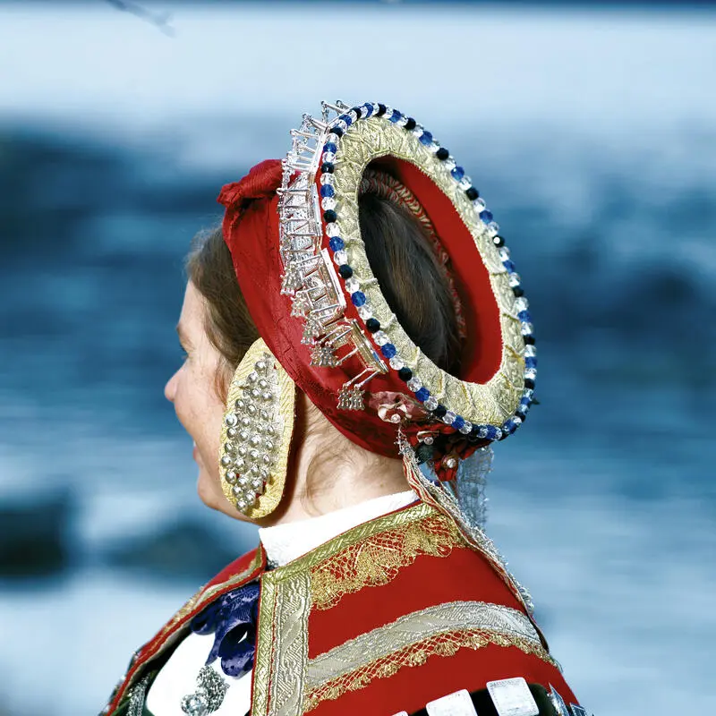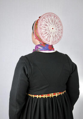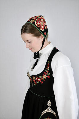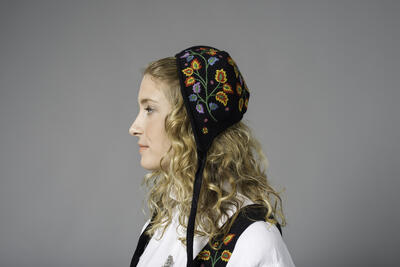 Her er ei del av hovudplagga som blir nytta til dei ulike bunadene frå Valdres.