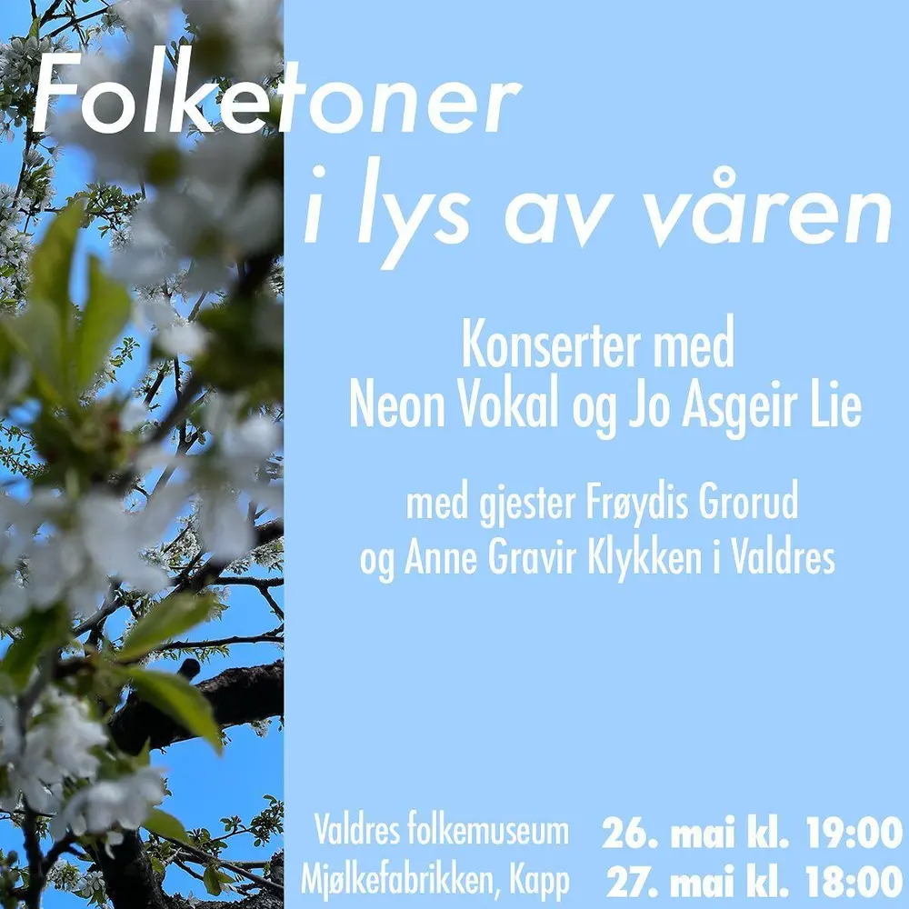 «Folketoner i lys av våren» blir en stemningsfull konsert hvor vi utforsker norsk folkemusikk i en av årets fineste årstider. Vi har gleden av å opptre med selveste Jo Asgeir Lie, samt dyktige Frøydis Grorud og Anne Gravir Klykken som blir med oss på konserten på Valdres Folkemuseum.