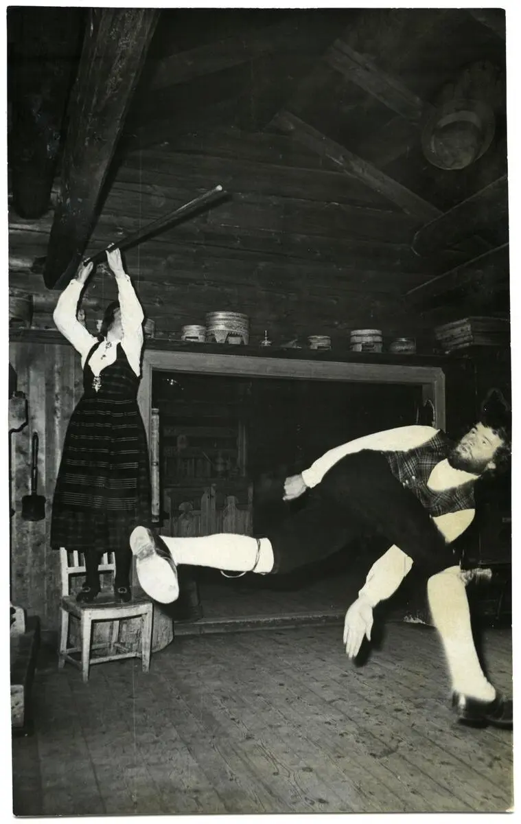 Ingar Ranheim dansar halling på Valdres Folkemuseum, 1975. Ukjent fotograf. VFF 4-002815. - 2/2