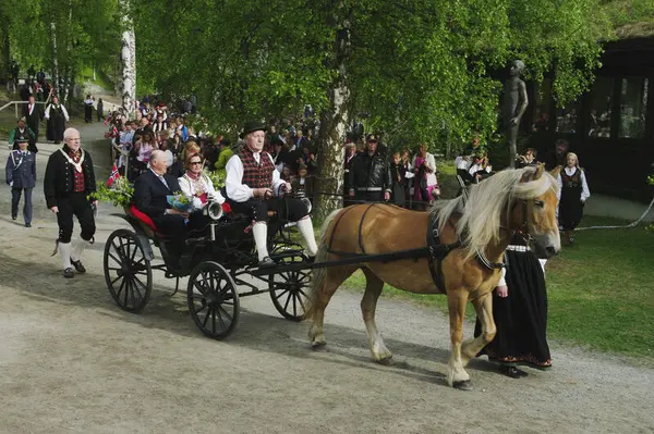 Jørgen Trøen var kusk under kongeparets besøk på Valdres Folkemuseum i 2010. Jørgen og hesten hans var elles modell for skulpturen i Fagernes sentrum. Foto: Fredrik Calmeyer.