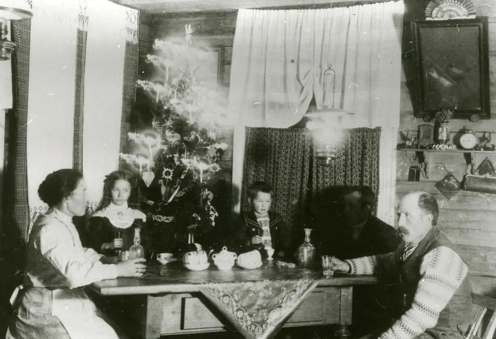 Julepynta stove på Granheim i Øystre Slidre ca. 1913-14. Her heng det julepynta kristneteppet i høgsetet, samstundes som dei har gjort plass for juletreet. Foto: Karl Berg. Meir info om biletet finn ein på DigitaltMuseum.no VFF ØS-129.