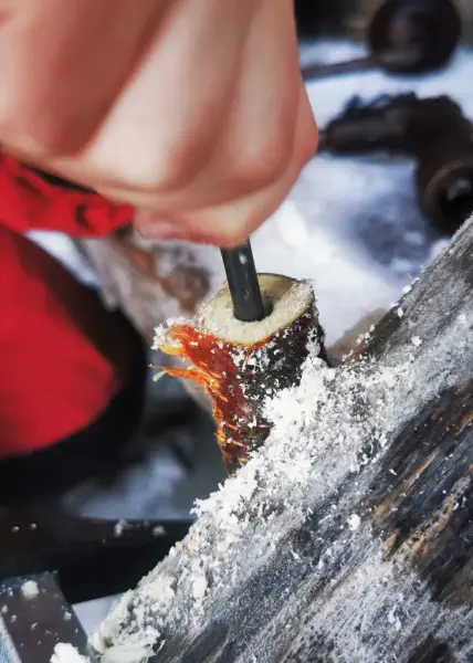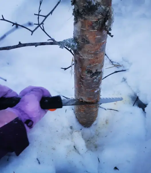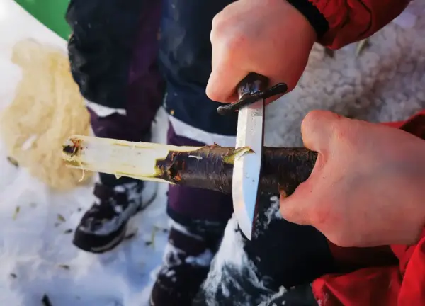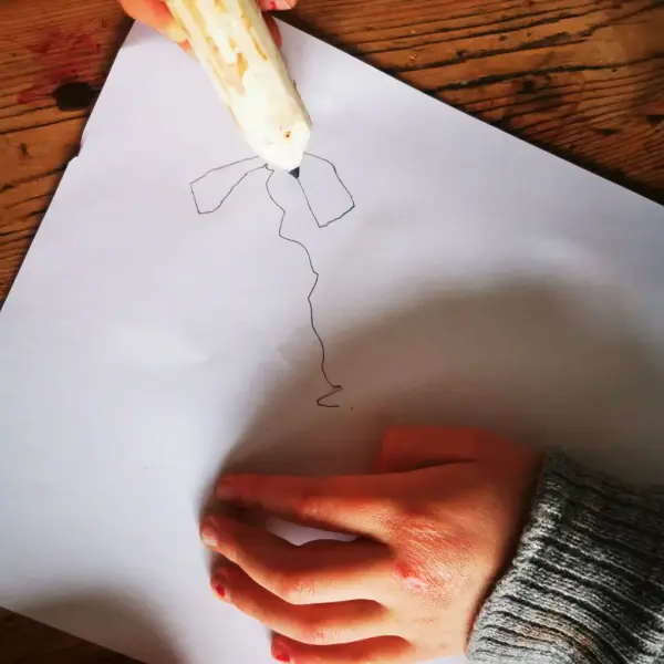 Vi går saman i skogen og finn emner i passe storleik til ein blyant. Så borrar vi eit hol med handbor, då er det lurt å samarbeide minst to og to. Det er viktig at ein borrar og ein sjekkar at boret er heilt rett, slik at blyet sit rett til slutt. Når holet er ferdig sett vi inn bly og spikkar blyantspissen med kniv. Dei som har lyst kan spikke mønster i blyanten. Når treet tørker over tid, vil det krympe og stramme seg rundt blyet.