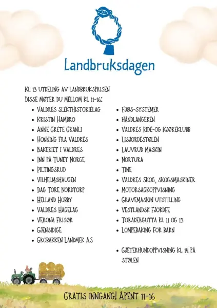 Landbruksdagen er ein møteplass som skal syne fram landbruket i Valdres. Dagen er fylt med ei rekkje aktivitetar som passar for heile familien. Arrangementet er gratis og ope for alle, velkomne til ein flott dag på Valdres Folkemuseum!