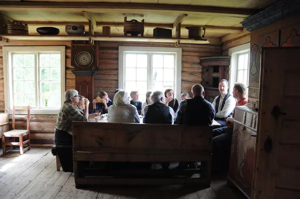 - Langbordet hadde òg fast plass, det same gjaldt korleis folka satt rundt bordet. Bonden satt øvst, i høgsetet, mellom framskåpet og hjørneskåpet. Gardkjerringa satt på den nedste bordenden. Den lange benken langs veggen var for mannfolka på garden. På benken inn mot rommet satt jentene og kvinnfolka. Der var det kort veg til gryter og kjøkkenstell. Måltida var styrd av rytmen av ein arbeidsdag.