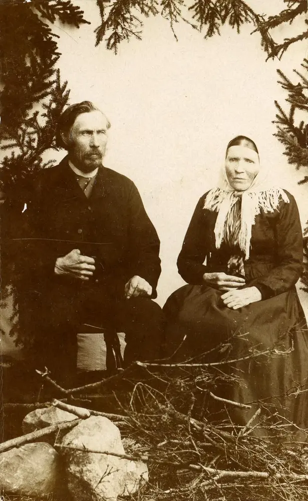 Foreldra til Ola i Brenno: Husmannsparet Anders Olsson Brenno (1833-1920) og Rannei Olsdotter Brue (1824-1918) frå Vøllseige. Ukjent fotograf. BV 83-099. - 3/3