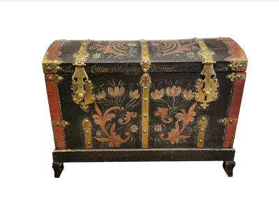 Salt, sild og korn i byte med skinn og smør og overskotsvarer. Hestevogn, omlasting, vassveg og båt. Vegane var tunge, men best fór ein vinterstid på fjordar og elvar. Bønder frå Valdres, handelskarar frå byen – og skreppekremmarar som alltid var på reise. Knappenåler og tråd. Eit silkeplagg og ei fele. Sjeldne varer fann vegen til Valdres. Dei som reiste på handel, trong sikre ferdaskrin. Vakre var dei òg, med utskjering, beslag og ranker i alle fargar.