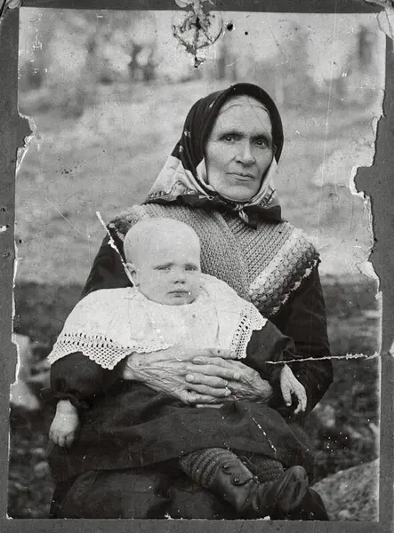 Rotasjon - portrettfoto 1/1 Tora O. Fløene (f. 1896) med barn på fanget. Dei budde i Åbjør i Nord-Aurdal. Biletet er del av fotoarkivet til Norsk institutt for bunad og folkedrakt. Legg merke til kleda deira. Åpne eller lukk biletetekst