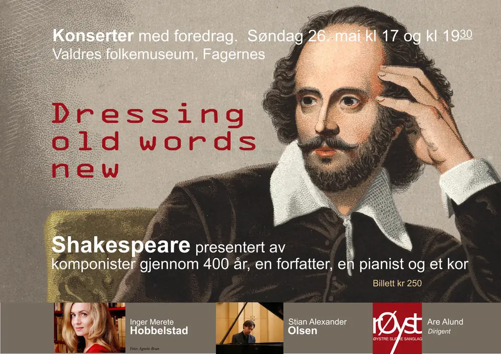 William Shakespeares verker har inspirert forfattere, komponister og kunstnere i 400 år. Nå inviterer Øystre Slidre sanglag til konsert hvor vi framfører kormusikk basert på Shakespeares tekster. Med oss på konserten har vi forfatteren Inger Merete Hobbelstad og pianist Stian Alexander Olsen.