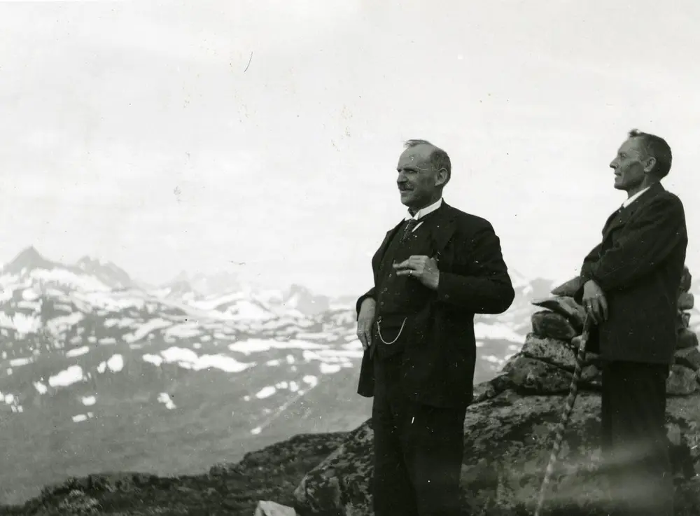 Innsamlingsferder i Valdres, 1934: Sigurd Islandsmoen (t.v.) tok turen via Tyin, Eidsbugarden og Bygdin under ein av sine tre folketoneferdar i Valdres. Fotograf: Knut Hermundstad. VFF 4-001156.
