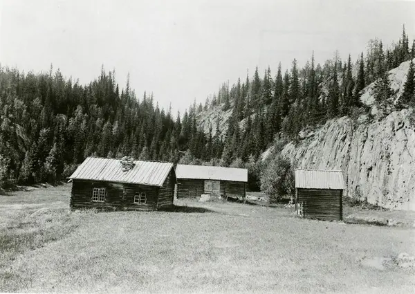 Husmannsplassane såg ofte ut omlag slik, med nokre små tømmerhus av ein jordflekk for dyrking av korn og potet. Her ser vi Dølvesknatten som truleg vart rydda og bygd i fyrste halvdel av 1800-talet. Fleire i familien spelte hardingfele. I folketeljinga i 1865 budde det ti personar i den vesle stova: Brukarparet Ola Kristaferson Dølveseige (1816-1885) og Tøran Olsdotter Strømmenseige (1817-1894), sju heimebuande ungar og i tillegg eit «lægdslem» på 83 år. Same år hadde dei 5 kyr, 9 sauer og 5 geiter, og om våren sette dei 3 tønner poteter og ei tønne blandingskorn. Dette biletet er teke i 1910. Då hadde plassen stått tom kring ti år, og det flytte aldri folk dit att. Ukjent fotograf. BV 89-024.  -  2/5