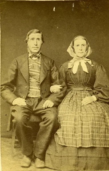 Kledeskikken I: Mikkjel Reiarson Dølven (1814-1888) tok over farsgarden Dølve i 1841. Han fekk seks ungar, der dei fem fyrste døydde som småungar. Etter at kona døydde i 1860, gifta han seg i 1863 med Marit Arnesdatter Øyhus (1829-1915). Dette er brudebiletet deira. Ukjent fotograf. BV 87-188.  -  3/5
