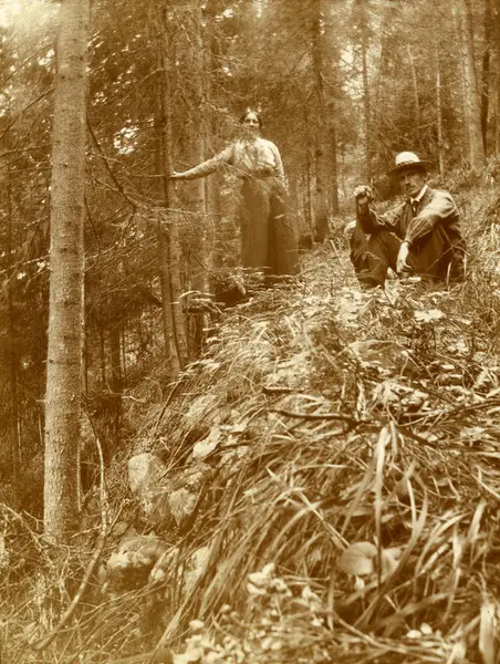 På den gamle hestevegen ovanfor Islandsmoen. Her er Olaus Islandsmoen (1873-1949) og svigerinna Ragna Islandsmoen (1881-1961). På 1900-talet lagde grendefolket betre veg opp i åsen på dugnad. Ukjent fotograf. BV 85-194.