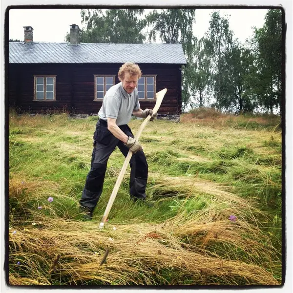 Fredrik, Sondre og Petter slår, raker og hesjer blomsterenga på museumshaugen denne helga. Kom og sjå og lær om ljåslått på gamlemåten. Foto: Anne Marit Noraker